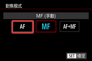 在選單中,將 [對焦模式] 設定為 [AF],或將鏡頭上的對焦模式開關設定為 [AF]。