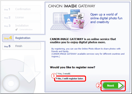 已按 [下一步 (Next)]。(要在 CANON iMAGE GATEWAY 上註冊,選擇 [是,現在註冊 (Yes, I would.)] 並完成註冊步驟。)