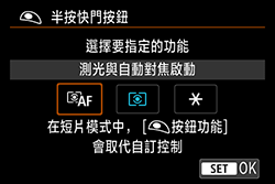 當啟用相機的自訂功能設定 (C-Fn),且 [快門按鈕/自動曝光鎖按鈕] 未設定為 [自動對焦/自動曝光鎖] (預設) 時,可能會停用自動對焦操作;如果半按快門按鈕,對焦指示燈可能不會亮起,具體取決於啟用了哪項設定。