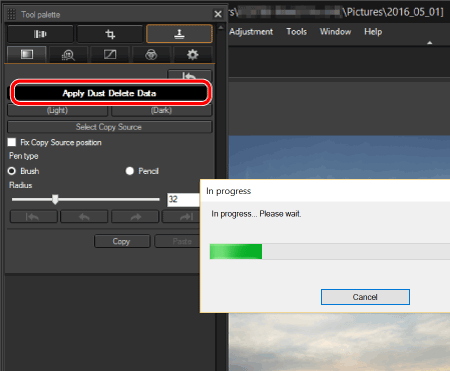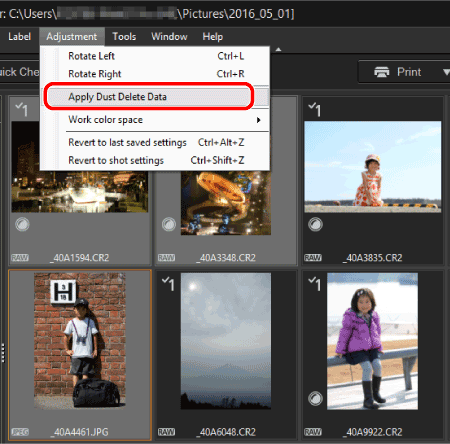 2. 從 [調整 (Adjustment)] 選單中選擇 [應用除塵資料 (Apply Dust Delete Data)]。