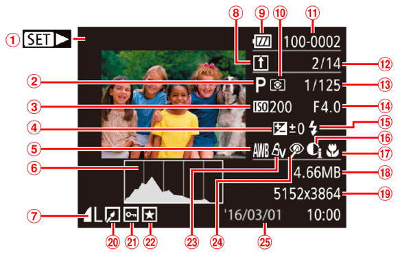 ![]() | 目前的影像編號/影像總數 | ![]() | 拍攝日期/時間 |