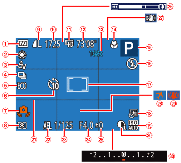 ![]() | 剩餘可記錄時間 | ![]() | 影像穩定器模式圖示 |