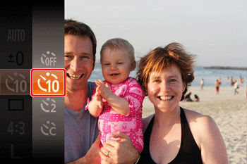 利用自拍,可以將自己加入集體照或其他定時拍攝。相機將在按下快門按鈕後約 10 秒鐘時拍攝。