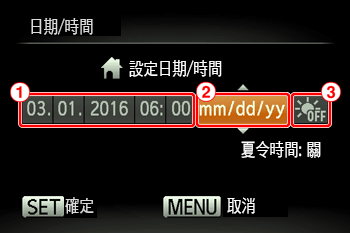 開機時,如螢幕顯示 [日期/時間] 畫面,請如下正確設定當前的日期及時間。您所指定的資訊會在拍攝時記錄為影像內容,而以拍攝日期管理影像或打印有日期的影像時將使用這些資訊。您亦可按需要加入拍攝日期標記。