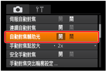 ] 按鈕選擇 [自動對焦輔助光],然後選擇 [開]。