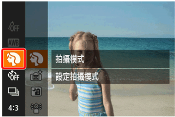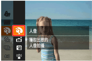 ![]() | 特殊場景 | 拍攝人像 | [人像] ( ) | 以柔和的效果拍攝人物照。 |