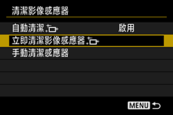- 即使重複清潔影像感應器,效果亦不會有太大改善。清潔影像感應器剛完成時,[立即清潔影像感應器] 選項暫時無法使用。