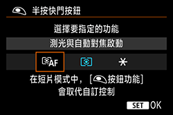當啟用相機的自訂功能設定 (C-Fn),且 [快門按鈕/自動曝光鎖按鈕] 未設定為 [自動對焦/自動曝光鎖] (預設) 時,可能會停用自動對焦操作;如果半按快門按鈕,對焦指示燈可能不會亮起,具體取決於啟用了哪項設定。