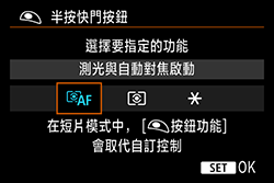 如果半按快門按鈕時無法操作自動對焦,自訂功能設定可能已作如下所示更改。