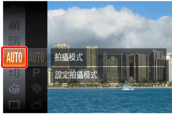 ] 按鈕,在選單中選擇 [AUTO],然後選擇拍攝模式。*相機銷售後,[AUTO] 將作為預設模式顯示。如果從未變更過設定,將顯示所選擇的拍攝模式。
