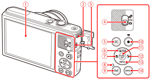 ![]() | [ (播放) ] 按鈕 | ![]() | [ (閃光燈)] / 右方按鈕 |