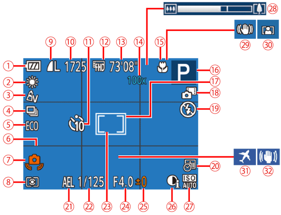 ![]() | 剩餘可記錄時間 | ![]() | 影像穩定器模式圖示 |