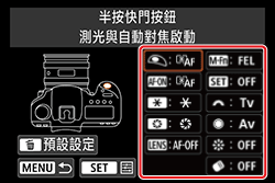 > 按鈕將根據設定執行自動對焦。<br>*2:在設定螢幕上,按下 <INFO.> 按鈕以顯示詳細的設定畫面。轉動 <