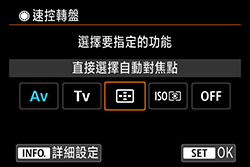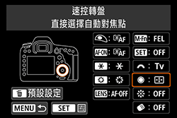*4:在設定畫面上,按下 <INFO.> 按鈕時,可選擇 [切換到中央自動對焦點] 或 [切換到已註冊自動對焦點]。
