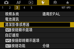 無論電源開關設定為 <ON> 或 <OFF>,影像感應器自動清潔裝置都會啟用以自動抖落感應器 (CMOS) 前端的灰塵。通常,您毋須注意此操作。但是,您可以隨時按照以下步驟運行影像感應器清潔。