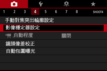 對於非 IS 鏡頭,如 EF-M 22mm F2 STM,[影像穩定器模式] 選單選項將不會顯示。