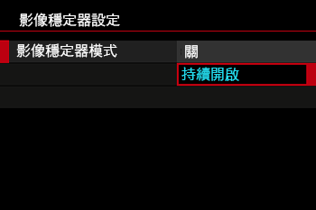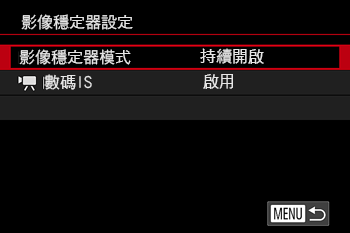 對於配備了影像穩定器功能的鏡頭,如 EF-M 18-55mm F3.5-5.6 IS STM,請參閱以下步驟設定影像穩定器。購買時,[影像穩定器模式] 選項已設定為 [持續開啟]。