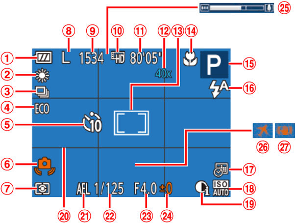 ![]() | 電池電量 | ![]() | 拍攝模式、場景圖示 |