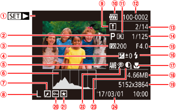 ![]() | 資料夾編號 - 檔案編號 | ![]() | 拍攝日期/時間 |