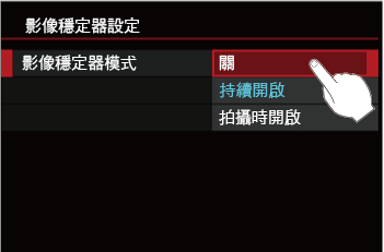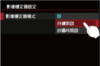 - 將 [影像穩定器模式] 設定為 [持續開啟]。
