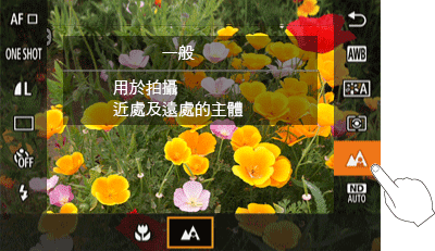 > 按鈕顯示設定螢幕,觸摸 [對焦範圍],然後選擇適合拍攝條件的設定。