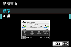 可以從 [標準] 或 [引導] 中選擇顯示方式。如果設為 [引導],則在按 <MENU> 按鈕時會提供主設定頁說明。如果設為 [標準],則在按 <MENU> 按鈕時會直接前往選單畫面。預設設定為 [標準]。