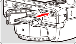 如圖所示,將記憶卡帶有標籤的一面朝著相機的背面插入直到發出「喀噠」聲。