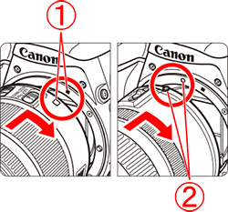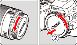 將鏡頭的紅色或白色標記與相機同顏色的標記對齊。按箭頭所示轉動鏡頭直到發出「喀噠」聲。