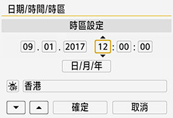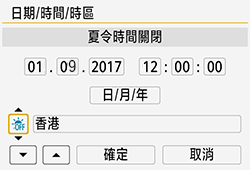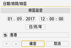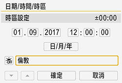 [時區設定] 中顯示的時間是與世界協調時間 (UTC) 相比較的時差。如果目標時區未列出,請參考與 UTC 的時差設定時區。