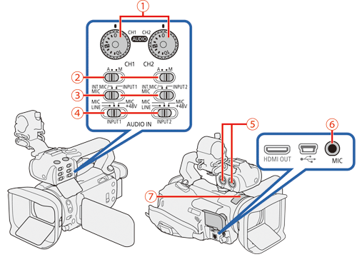 此攝錄機具有四聲道線性 PCM 或雙聲道 MPEG-2 AAC-LC 音頻記錄及播放的功能。取樣頻率為 48 kHz 且音頻取樣位元深度為 16 位元。可以使用 INPUT 端子* (市面有售的麥克風或模擬 LINE-IN 音頻來源)、MIC 端子 (市面有售的麥克風) 或內置麥克風記錄音頻。