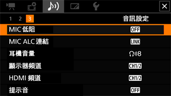 音訊設定 ] -> [MIC ALC連結] 設定連結與 MIC 端子相連的外置麥克風 L 及 R 頻道的聲音音量調整。選擇 [