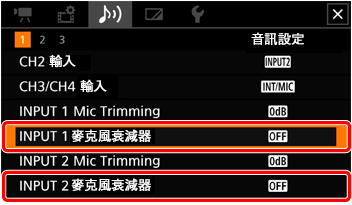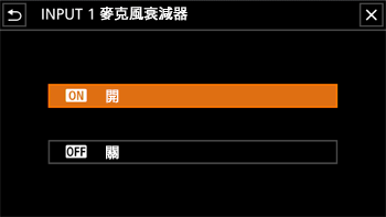 音訊設定] -> [INPUT 1麥克風衰減器] 或 [INPUT 2麥克風衰減器]。
