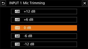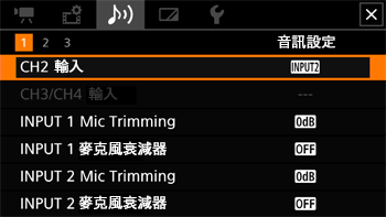 音訊設定] -> [INPUT 1 Mic Trimming] 或 [INPUT 2 Mic Trimming]。