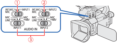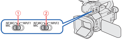 如果手柄單元連接至攝錄機,請將兩個音頻輸入選擇開關設定為 INT.MIC/MIC。