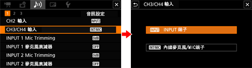 音訊設定] -> [CH3/CH4輸入] -> [INPUT端子]。