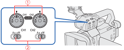 手柄單元安裝至攝錄機時,請將所需頻道的聲音音量開關設定為 A (自動),攝錄機可自動調整頻道的聲音音量。如果未安裝手柄單元,請使用 FUNC 選單調整聲音音量。