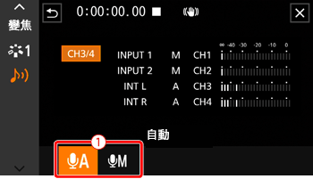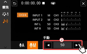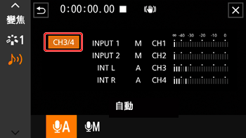 LPCM 16bit 4CH ] 時,請使用 FUNC 選單中的音頻螢幕調整 CH3 及 CH4 的音頻記錄音量。如果手柄單元未安裝至攝錄機,還必須使用音頻螢幕調整 CH1 及 CH2 的音頻記錄音量。