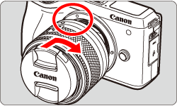 1. 將鏡頭的白色安裝標記與相機的白色安裝標記對齊,按箭頭所示轉動鏡頭直到發出「喀噠」聲。