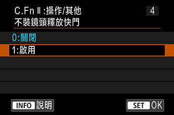 要在未安裝鏡頭時釋放快門,請使用以下步驟將 [自訂功能] 選單中的 [不裝鏡頭釋放快門] 選項設定為 [啟用]。