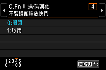 > 鍵選擇 [4:不裝鏡頭釋放快門],然後按 <