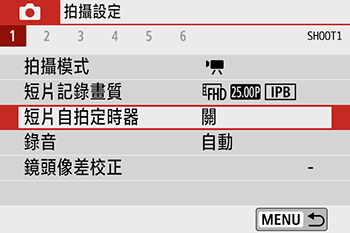 > 按鈕選擇 [短片自拍定時器],然後按 <