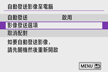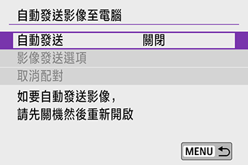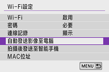 選單 > [無線通訊設定] > [Wi-Fi 設定] > [自動發送影像至電腦]。
