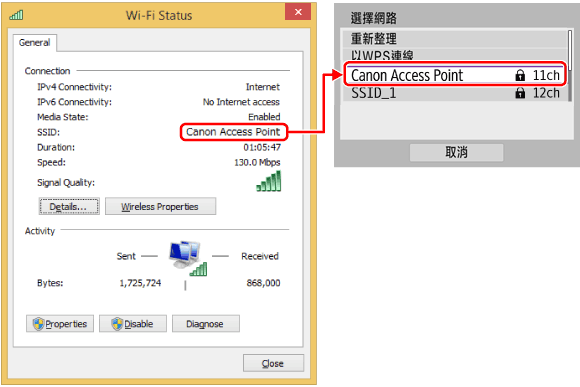 > 選擇與 [SSID:] 中所示的一個 SSID 相符的 SSID,然後按下 <